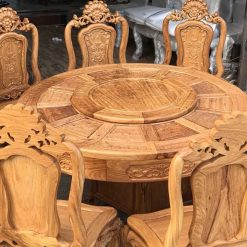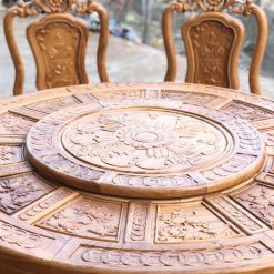 Điểm ấn tượng và sự nổi bật nhất bộ bàn ghế tròn xoay 8 ghế gỗ gõ đó chính là ở chiếc bàn tròn được thiết kế vô cùng tinh xảo, bắt mắt. Tại trung tâm bàn ăn đó chính là một chiếc bàn tròn nhỏ nhắn để chúng ta trưng bày đồ đồ ăn trên đó. Bên dưới được phân chia đồng đều 12 ô hình giúp bạn đặt bát đĩa lên đó để ăn.