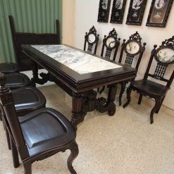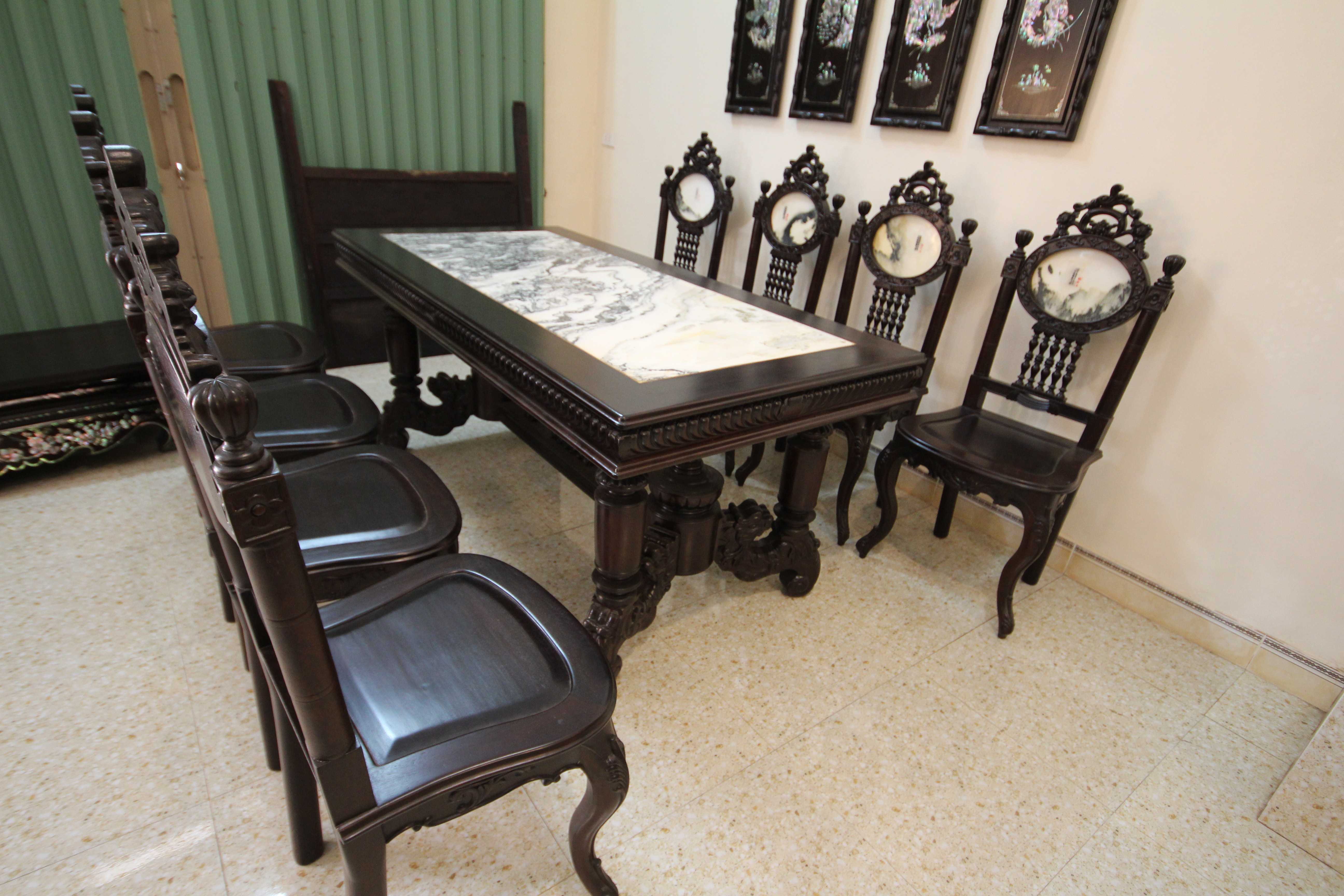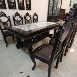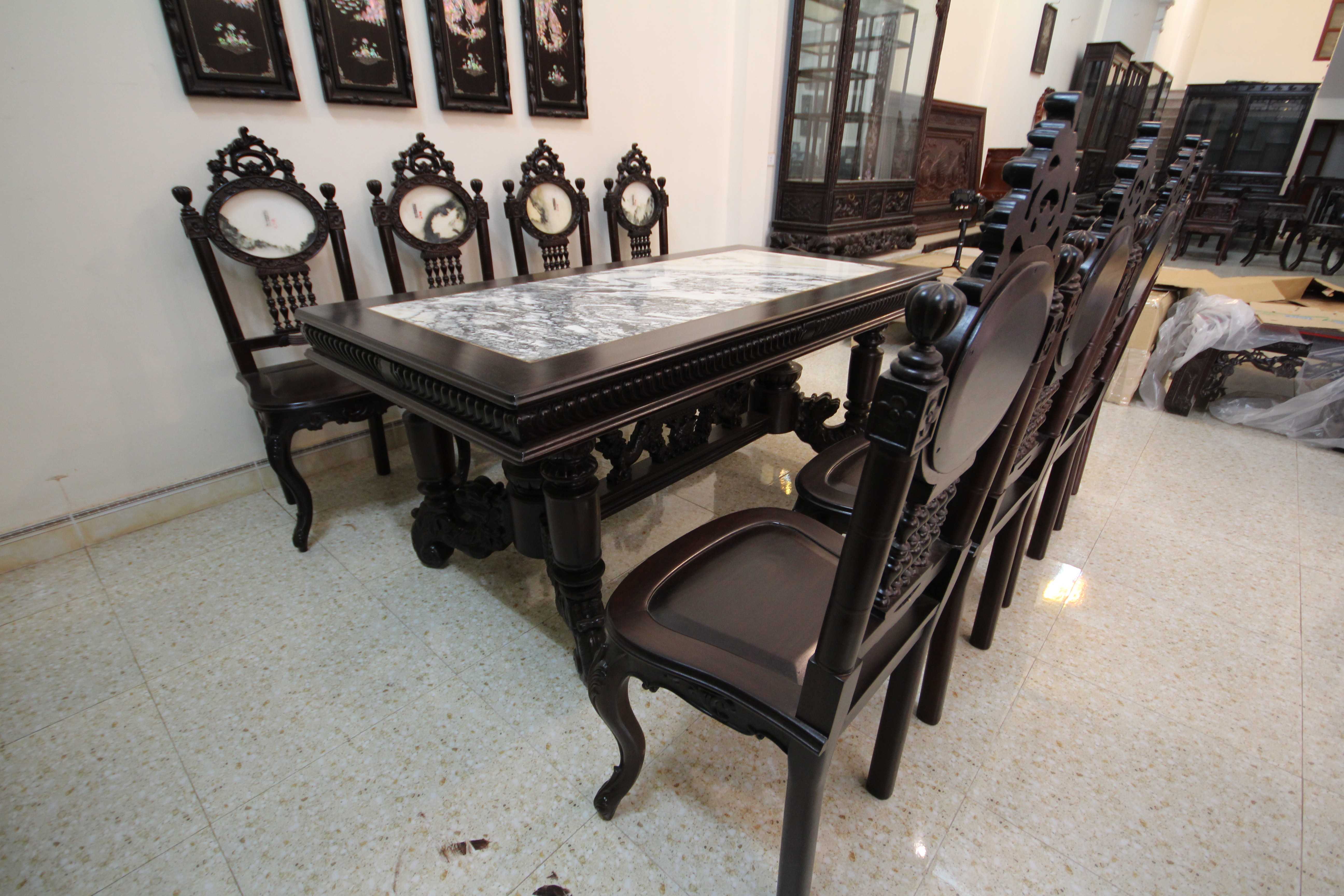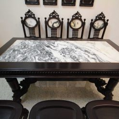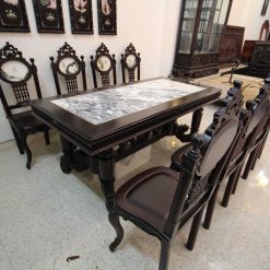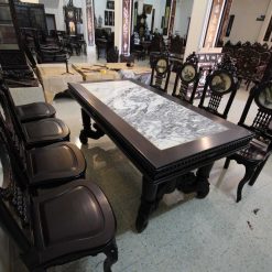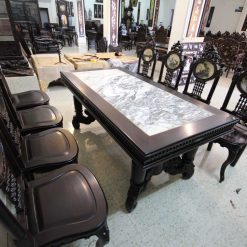 Khá nhiều người khi đến thăm cơ sở đồ gỗ Minh Toàn đều bị hút mắt bởi vẻ đẹp kiêu sa, nhẹ nhàng của bộ bàn ăn này. Nhìn tổng thể bộ bàn ăn này rất lộng lẫy, sang trọng. Hơn nữa, mặt bàn được ốp bằng đá tự nhiên có vân núi nhìn rất nho nhã, hoài cổ và tạo cảm giác bí hiểm. Quây bàn dày dặn, chắc khỏe tạo sự vững trãi, khỏe khoắn cho toàn bộ bàn ăn.