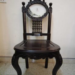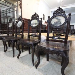 Tựa ghế được thiết kế khá thoải mái nhẹ nhàng với sự xuất hiện của 4 con tiện đặt ngay chính giữa tựa ghế. Bên trên là hình elip mặt đá với đường viền hoa văn mềm mại tạo sự vững vàng, uy nghi cho chiếc ghế. Trên chóp ghế ăn được nghệ nhân sử dụng những họa tiết Louis Pháp với đường cong nhẹ nhàng, và thêm sự xuất hiện của 2 bông hồng nhìn rất tinh tế và điệu đà cho chiếc ghế.