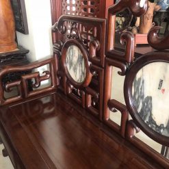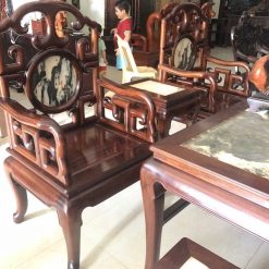Bộ bàn ghế móc mỏ gỗ gụ 6 món được thiết kế theo phương pháp lối xưa nhưng vẫn ẩn chứa nét đẹp hiện đại chắc chắn sẽ mang đến không gian ngôi nhà tươi mới, trẻ trung và thêm phần quyến rũ. Bộ bàn ghế móc mỏ gỗ gụ gồm 6 món với kích thước khá lớn được chế tác kiểu dáng móc mỏ, tựa ghế mặt bàn ốp đá tự nhiên có vân đẹp tựa như mây núi, với màu cánh gián non nhìn rất quý phải và có giá trị cao.