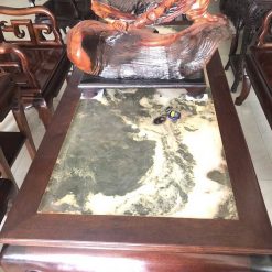 Có thể thấy rằng, chiếc bàn của bộ bàn ghế móc mỏ 6 món gỗ gụ được thiết kế 2 tầng với độ cao vừa phải. Nhìn chiếc bàn thiết kế rất nhẹ nhàng, mềm mại nhưng rất khỏe khoắn. Được tuyển chọn từ gỗ gụ cao cấp, không mối mọt, nứt nẻ nên tạo được dáng bàn thanh mảnh. Điểm thêm mặt đá tự nhiên siêu vân khiến cho chiếc bàn trở nên đắt giá, và nâng thêm tầm cao mới.