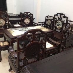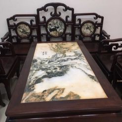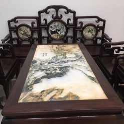 Chúng ta cùng chuyển qua mặt bàn của bộ bàn ghế móc mỏ gỗ gụ cỡ đại có gì đặc biệt và hớp hồn mọi ánh nhìn nhé. Đó chính là mặt bàn của bộ bàn ghế này được ốp bằng đá tự nhiên có hình vân núi non bồng bềnh trôi nổi khá là uyển chuyển, nhịp nhàng. Chính việc ốp mặt đá lên tấm bàn càng khiến cho bộ móc mỏ trở nên cao sang, hiện đại hơn bao giờ hết. Những vân đá vàng, đen hòa nhịp duyên dáng với nhau tạo những dãy núi cao trùng trùng điệp điệp mang đến một tinh thần mới, một sức sống mới. Hơn nữa, việc ốp mặt đá cho mặt bàn sẽ luôn luôn tạo sự khang trang, tươi mới cho bộ ghế. Đó chính là nét đẹp quý phải mà chỉ có bộ bàn ghế móc mỏ gỗ gụ mới sở hữu được vẻ đẹp chân ái như vậy.
