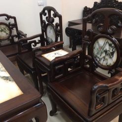 Điều hay của bộ ghế móc mỏ gỗ gụ này là ở phần tựa ghế, vai ghế được thiết kế khá thông thoáng, gợi mở. Đặc biệt chính giữa trung tâm tựa ghế đó chính là một hình tròn được ốp mặt đá hình vân núi bồng bềnh trôi luôn mang đến sự khoan thai, nhẹ nhàng cho mọi người mỗi khi nhìn vào.