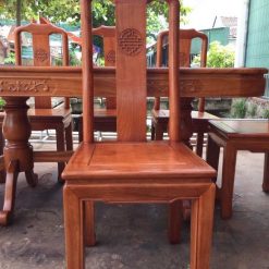 Đây là một trong 6 chiếc ghế nằm trong bộ bàn ghế ăn 6 ghế gỗ gõ đỏ mà Minh Toàn sản xuất. Chiếc ghế thiết kế rất đơn giản với tựa ghế thiết kế cực kỳ thoáng nhưng cao. Chính giữa tựa ghế nghệ nhân đã điểm thêm hình ảnh chữ Thọ với ẩn ý mang đến sự trường thọ an vui cho gia chủ. Mặt ghế thiết kế trơn chu ẩn hiện dưới lớp màng vàng sang là những đường vân gỗ hương đa kiểu dáng nhìn rất đẹp.