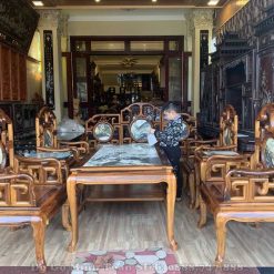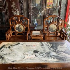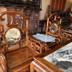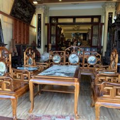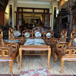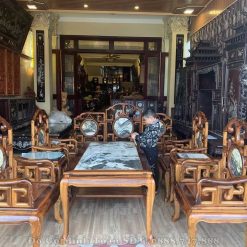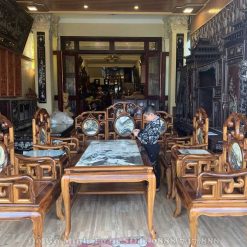 Và như quý vị thấy đấy, trong cửa hàng đồ gỗ Minh Toàn chúng tôi cũng kê bộ bàn ghế móc mỏ gỗ gụ 9 món theo hình chữ U vừa giúp khách hàng dễ dàng nắm bắt được mẫu dáng của bộ bàn ghế vừa tạo sự quyến rũ và tôn lên không gian sống thoáng cho ngôi nhà.
