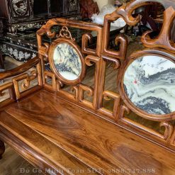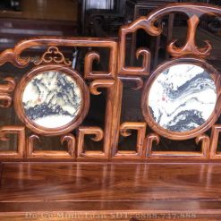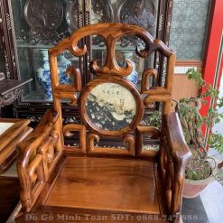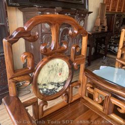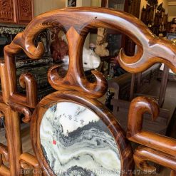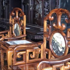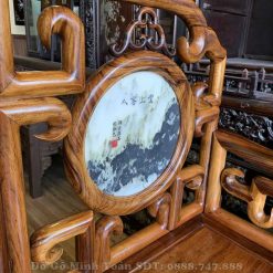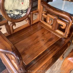 Đây là mặt ghế của chiếc ghế đơn được chà nhám nhẵn bóng như gương soi. Với tựa ghế được thiết kế theo mặt dựng đứng sẽ là tấm dựa chắc chắn và thoải mái cho người ngồi. Đặc biệt hơn cả, bộ bàn ghế móc mỏ gỗ gụ ta 9 món nhìn rất thông thoáng, mát mẻ khi sở hữu những được triện móc liên kết chặt chẽ theo từng góc cạnh vuông nhìn rất đẹp. Chính giữa trung tâm tựa ghế là sự xuất hiện của lô đá vân núi hình tròn tượng trưng cho sự tròn đầy, viên mãn và tạo sự sung túc, đầy đủ cho gia chủ nào sở hữu được bộ bàn ghế móc mỏ này.
