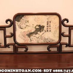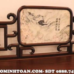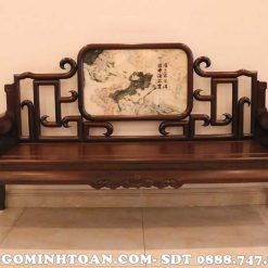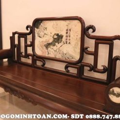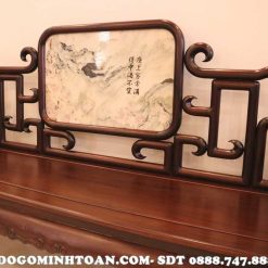 Về phần tựa ghế, thì được đồ gỗ Minh Toàn thiết kế tựa ghế liền khối với chính giữa ghế ngồi là sự xuất hiện của mặt đá tự nhiên vân núi nhìn rất bồng bềnh, êm ả. Cho cảm giác nhìn bình an, tâm hồn nhẹ nhàng. Xung quanh mặt đá được bao bọc bởi những được triện móc mỏ nhìn rất mềm nuột, cong vút với độ bóng cực đỉnh càng khiến tôn lên vẻ đẹp hào nhoáng cho bộ ghế. 2 tay ghế được thiết kế hình khối tròn dài giống như một chiếc gối, mặt trước tay ghế có ốp thêm lô đá tròn nhỏ tạo điểm nhấn sinh động cho ghế phương kỷ.