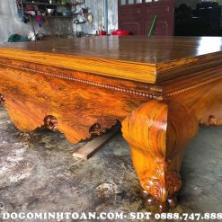 Đây là mặt góc quây sập được thiết kế rất vuông vức và có độ sắc nhọn khá chao. Chân sập là bộ sập chân quỳ thế nên chân sập cũng không quá cao với độ mập mạp vừa phải khỏe khoắn nâng đỡ toàn bộ chiếc sập gỗ lên. Đế chân sập được điểm thêm những họa tiết hình ốc sên mang đến vẻ đẹp thanh cao, quyền quý cho bộ sập.