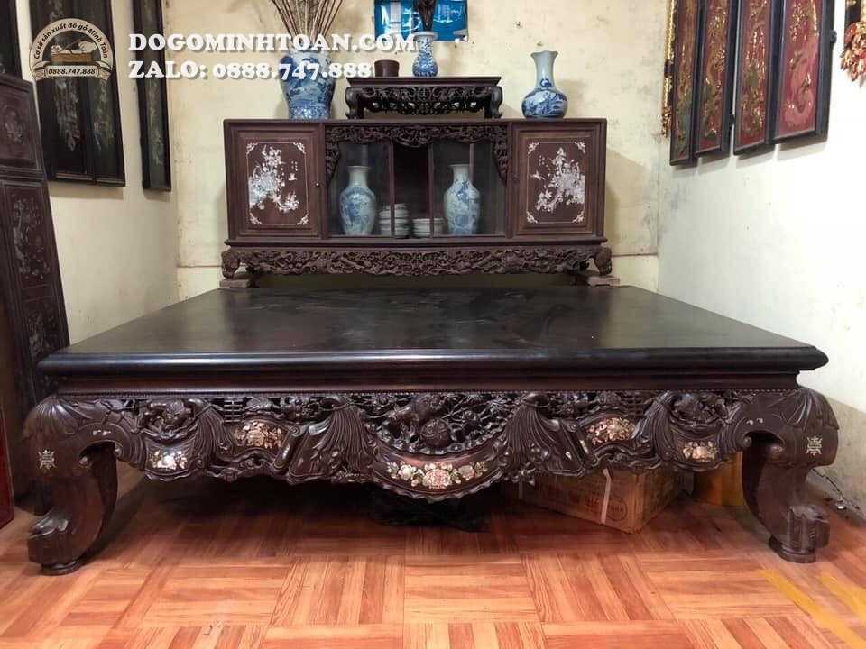 Sập vắt vải khảm ốc gỗ gụ là một trong những bộ sập gụ phổ biến hiện nay hay được trưng diện tại không gian phòng khách, phòng thờ. Thường thì sập vắt vải khảm ốc hay được kết hợp với tủ chè và trưng bày thêm nhiều món đồ phụ kiện khác như: tranh gỗ, câu đối, lộc bình sẽ tạo được không gian thanh tịnh, ấm áp, gần gũi nhưng vẫn toát lên được sự sang trọng, lộng lẫy đậm chất phong cách quý tộc, vương giả.