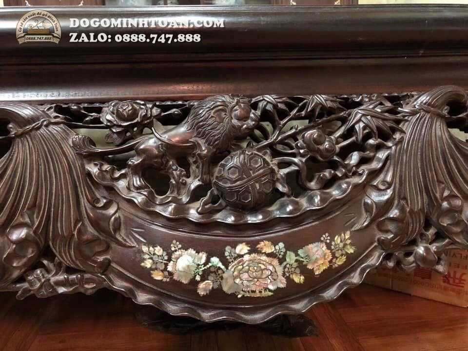 Đây chính là toàn bộ hình ảnh quây sập mà chúng tôi chụp theo góc nghiêng để quý vị dễ dàng hình dung và cảm nhận. Đan xen giữa những hình ảnh vắt vải mềm mại là những họa tiết, hình tượng ngũ lân vờn cầu đang tung tăng nhảy múa sinh động. Hình ảnh chữ Phúc đan xen trên quây sập với mục đích mang đến hạnh phúc ấm no, sum vầy cho gia chủ.