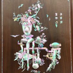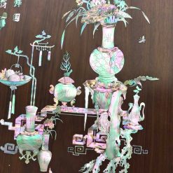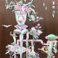 Cái đắt giá nhất của bộ tủ chè khảm đông bích đục ngũ phúc đó chính là tích đồ thư được khảm xung quanh cánh tủ. Từ lộc bình cho đến kệ trưng bày đồ cổ đều được nghệ nhân khảm sen lọng với chất ốc singapo nhiều sắc màu được phản quang, tán sắc nhìn đẹp lung linh, sáng trưng cho chiếc tủ. Nét khảm nhìn rất nuột nà với những chi tiết khảm khó như thân cây, bông hoa, chim chóc…Tất cả đã đựng lên một bức tranh thiên nhiên sinh động, có hồn.