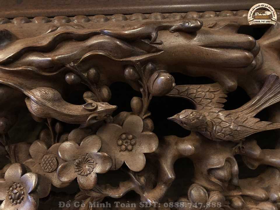 Đây là hình ảnh thân cây mai thưa quý khách, nó được đục chạm cực kỳ cầu kỳ và tinh xảo. Thân cây uốn lượn, xù xì kết hợp với những bông hoa mai nở rộ, chim chóc chuyền cành khiến bức tranh trở nên tươi đẹp hơn. Nhìn rất có hồn và có giá trị cao. Chính bởi kỹ thuật đục chạm kênh bong khiến từng hình ảnh, chi tiết trên quây sập được trẻ hóa và nhìn rất hoàn mỹ.