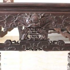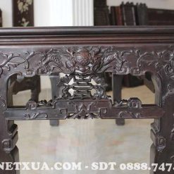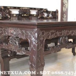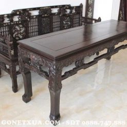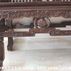 Bàn cũng được chạm lấy nền hình vân khúc – trường kỷ Huế vân khúc. Mọi góc cạnh của bàn được làm tỉ mỉ, trông khá khỏe khoắn.