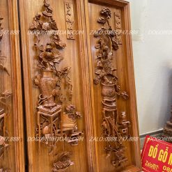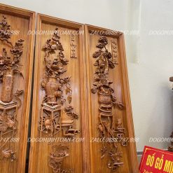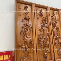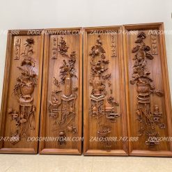 Bộ tranh gỗ tứ bình được biết đến là một loại tranh trục, bao gồm tất cả 4 bức tranh được sử dụng với mục đích chính đó là trang trí trong gia đình như: phòng khách, phòng làm việc. Bộ tranh tứ bình hay được gọi là đại diện của 4 mùa xuân hạ thu đông trong năm và được xem là vật phẩm phong thuỷ mang đến nhiều may mắn cho gia chủ. Bức tranh tứ quý này được đồ gỗ Minh Toàn đục chạm kênh bong nên hình ảnh cây tùng, hoa sen, hoa cúc, hoa mai giống như hình ảnh 3D nổi bật trên nền gỗ.