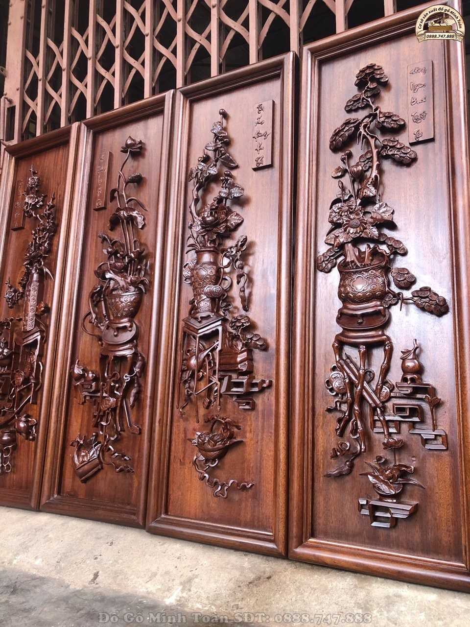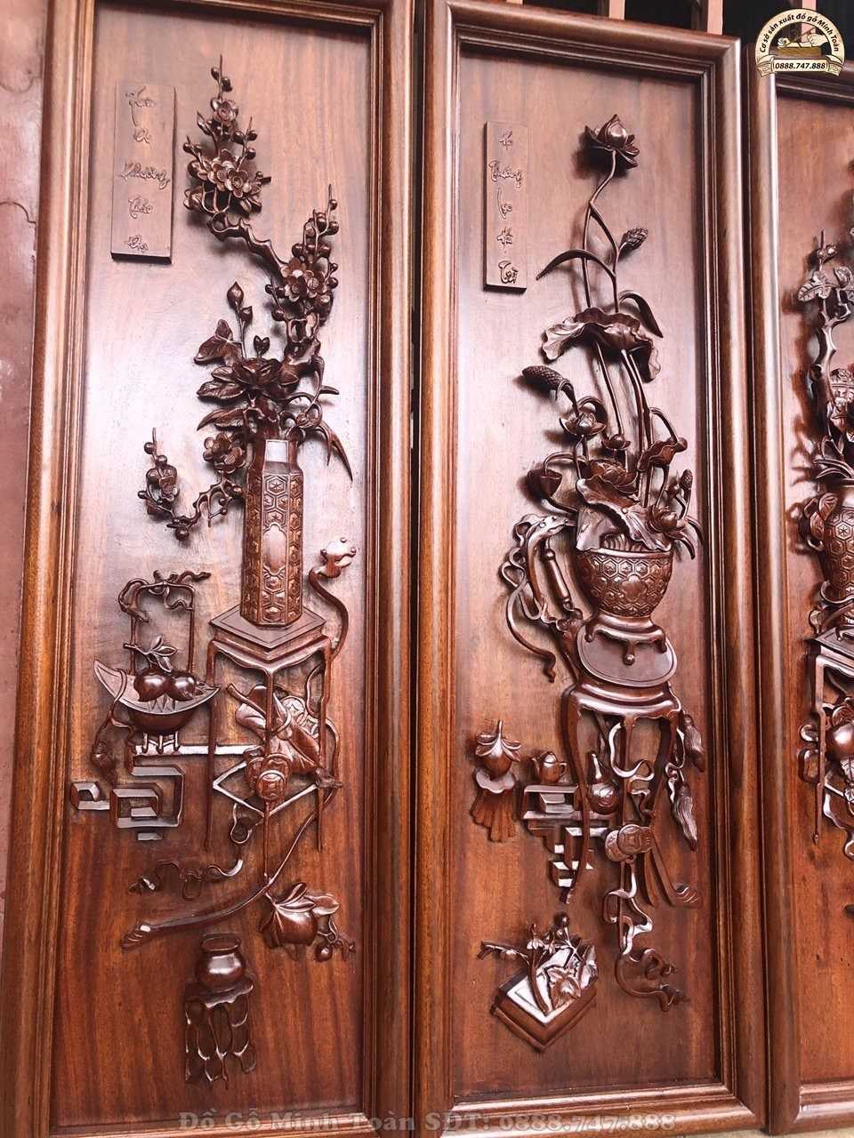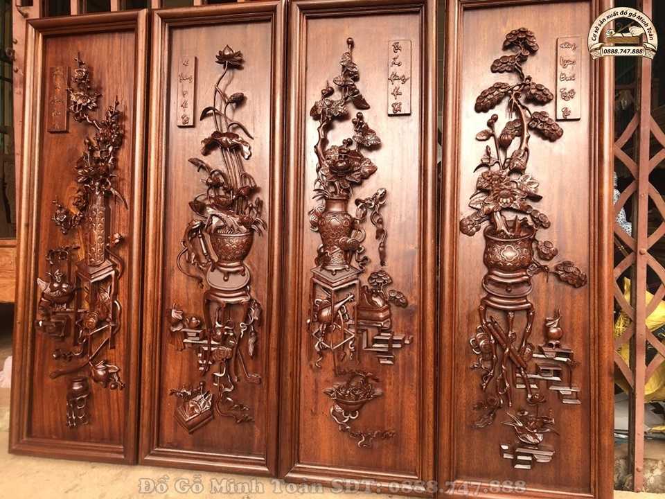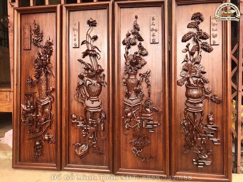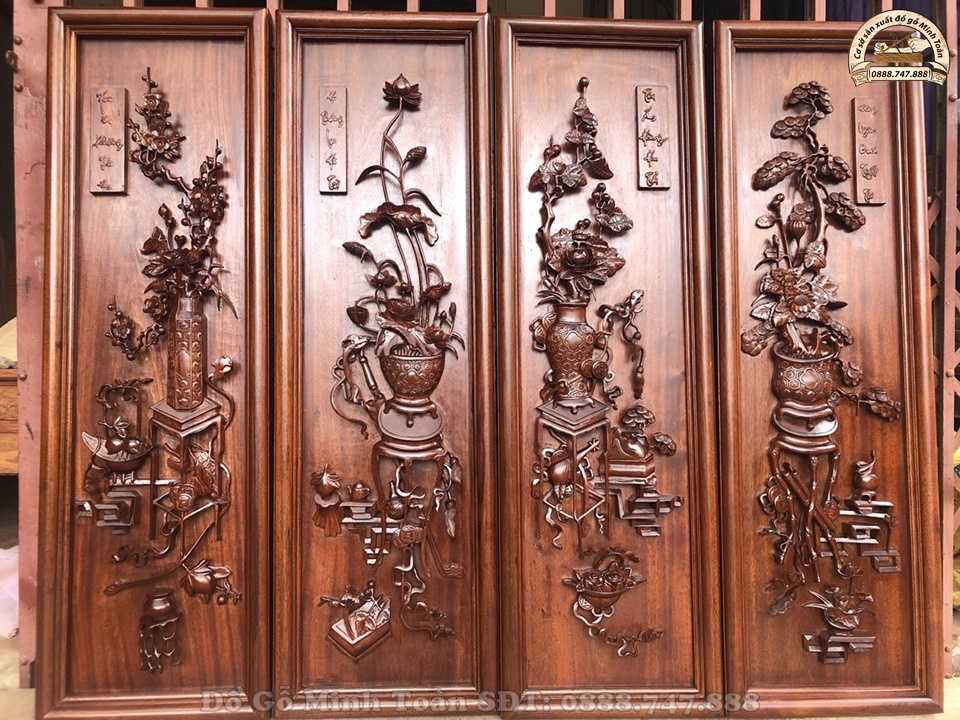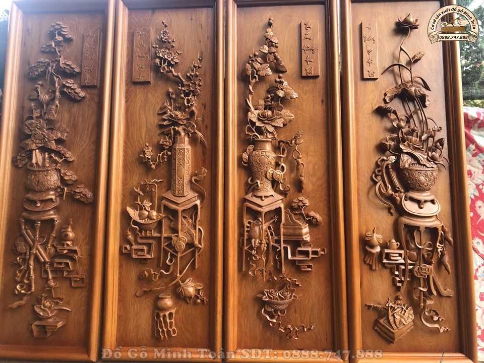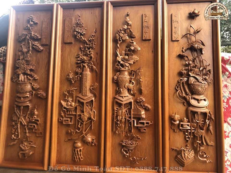 TG52 Tranh Gỗ Gụ Đục Tứ Bình Hàng Kênh Bong ( Anh Cường, Hải Dương )