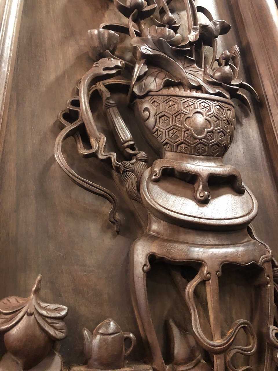Bức tranh tứ bình hàng cũ được chế tác rất kỳ công và tỉ mỉ. Ở đây hình ảnh những loài hoa được cắt tỉa nghệ thuật và được cắm trong 4 cái bình; 4 cái bình lại được đặt trang trọng trên 4 cái kệ, kèm theo một số loại quả và vật dụng nhằm miêu tả “mùa nào thức ấy” nhìn rất đẹp và tạo sự nhẹ nhàng, thăng hoa cho người chơi khi nhìn vào bức tranh.