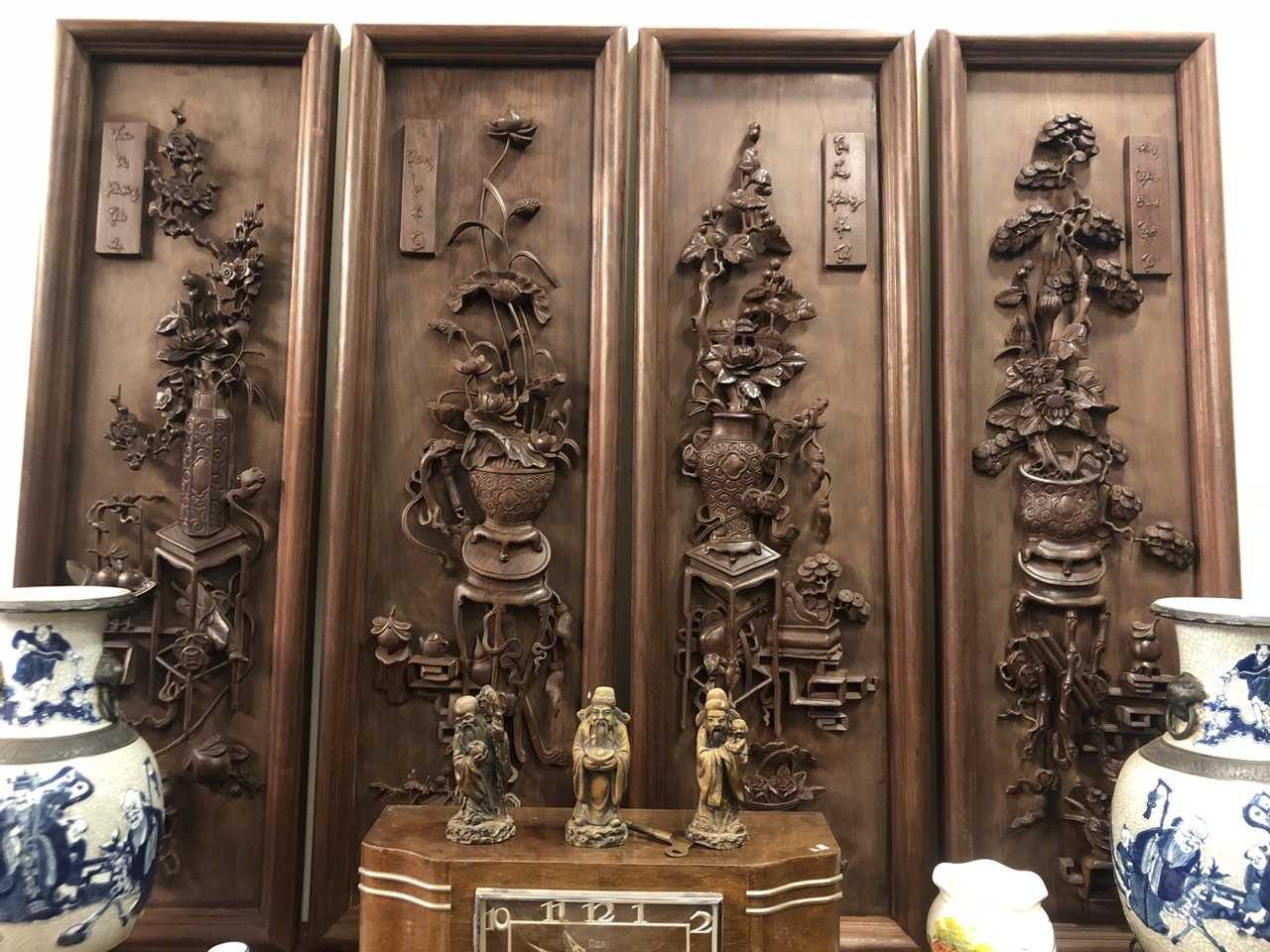 Tranh tứ bình hàng cũ là một bộ tranh tứ quý khá nổi tiếng được nhiều thực khách săn lùng để trang trí phòng khách, phòng đọc sách hay phòng làm việc. Bộ tranh tứ bình là một bộ tranh đại diện cho 4 mùa Xuân – Hạ – Thu – Đông. Trên mỗi bức tranh đều thể hiện những loài hoa nở vào 4 mùa. Những loại hoa này được cắt tỉa rất nghệ thuật với kỹ thuật đục chạm kênh bong thế nên bạn sẽ rõ được hình ảnh của từng loài hoa.