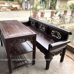 - Tên sản phẩm: Bộ bàn ghế trường kỷ đục sen cò thủng 3 món gỗ gụ mật
