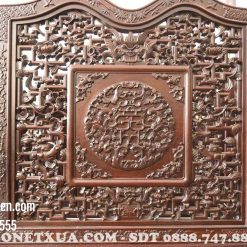 Mặt sau của mẫu trường Huế này, cũng được đục chạm như mặt trước, các chi tiết đều rõ ràng, sắc nét làm nổi bật lên hình chữ Thọ. Các đường gấp khúc, cho đến đường cong đều rất nuột, mềm mại, uyển chuyển giúp cho bộ trường này trở nên cuốn hút mắt hơn.