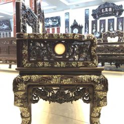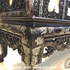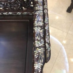 Khi nhìn vào, bạn chắc chắn sẽ bị ấn tượng bởi sự sang trọng của những bộ trường kỷ cẩn ốc. Các họa tiết, hoa văn trên vật dụng kết hợp với nhau vô cùng hài hòa. Tác phẩm gồm tổng 3 món được làm từ chất liệu gỗ gụ.