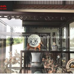 Phần trên của tủ được sử dụng tấm kính cao cấp trong suốt để có thể khoe được những món đồ cổ tinh túy: đĩa cổ, bình cổ…nhìn rất sang trọng.